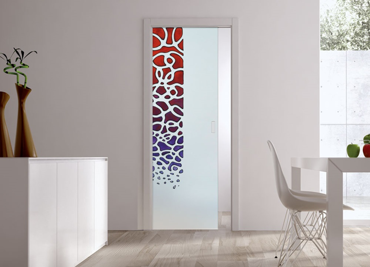 The stunning hand painted Karis glass door lets the light shine through and makes the most of the natural light in a property. The marriage of the striking hand painted glass door and the high quality Eclisse pocket door system results in a sliding pocket door system that is functional and practical, and also a unique, hand-crafted piece of art.
