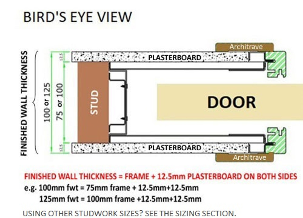 - What is FINISHED WALL THICKNESS? Click here for diagram. Finished wall thickness is the thickness of the frame i.e. 75mm or 100mm plus 12.5mm plasterboard on both sides. So for a 3″ (75mm) stud you should choose the 100mm finished wall thickness (i.e. 75mm frame plus 12.5mm plasterboard both sides). For a 4″ (100mm) stud you should choose the 125mm finished wall thickness (i.e. 100mm frame plus 12.5mm plasterboard each side).