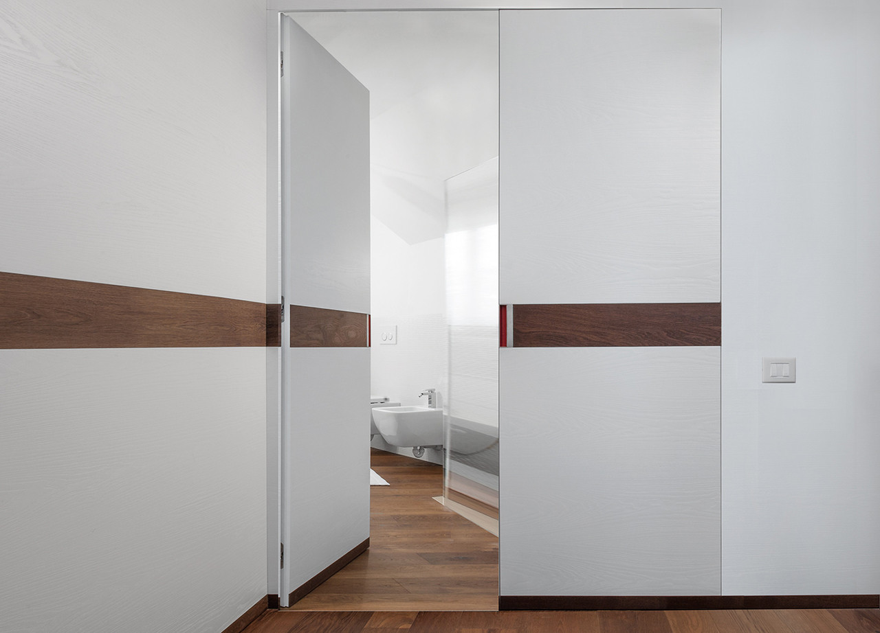 Syntesis® Flush Hinged is an Eclisse concealed door frame system without the need for jambs or architrave. The Syntesis® Flush Hinged frame has an innovative profile that allows for a crisp plaster finish right up to the edge. The double version comes supplied with our ready to paint primed doors for the perfect minimalist interior.