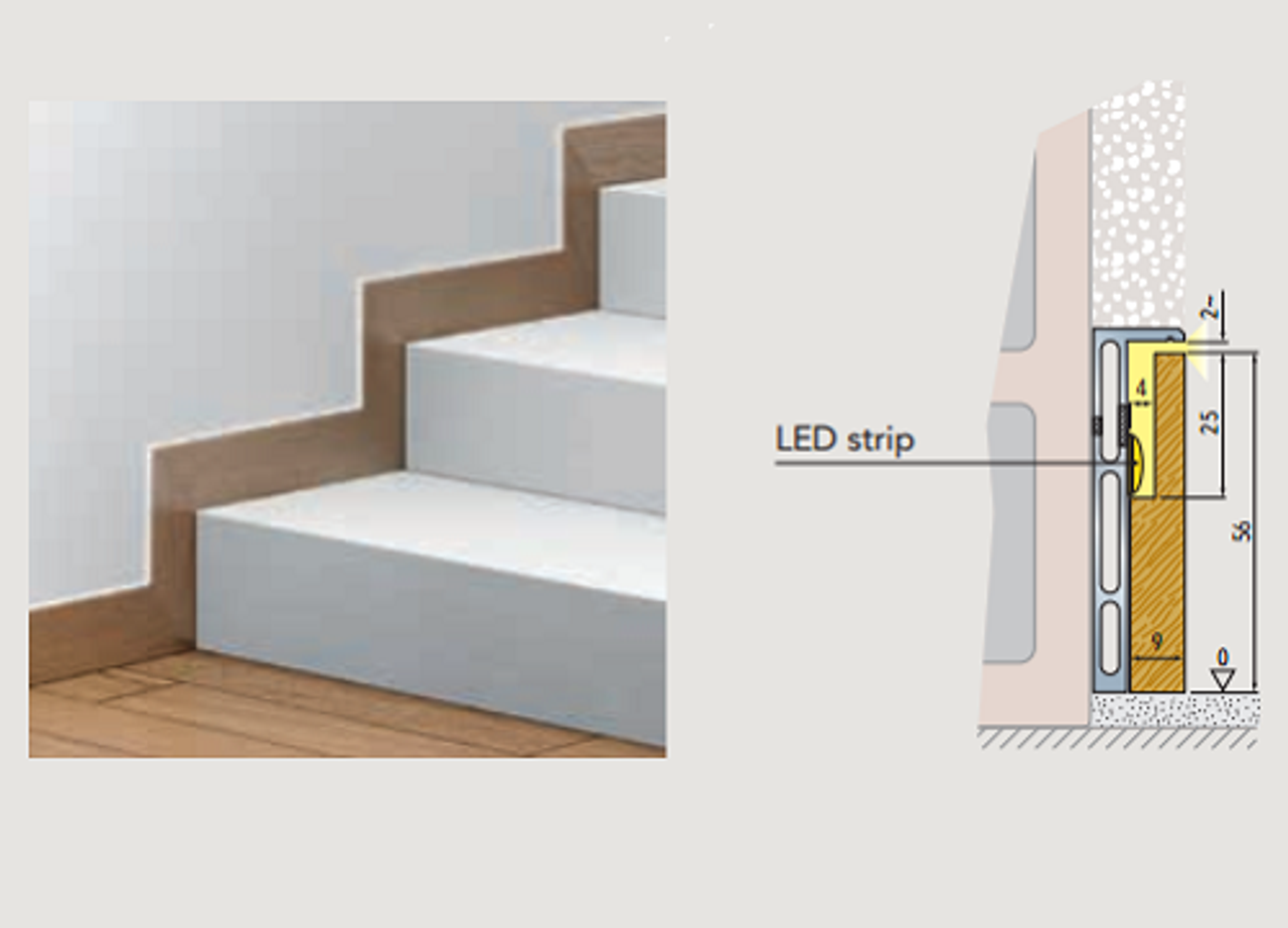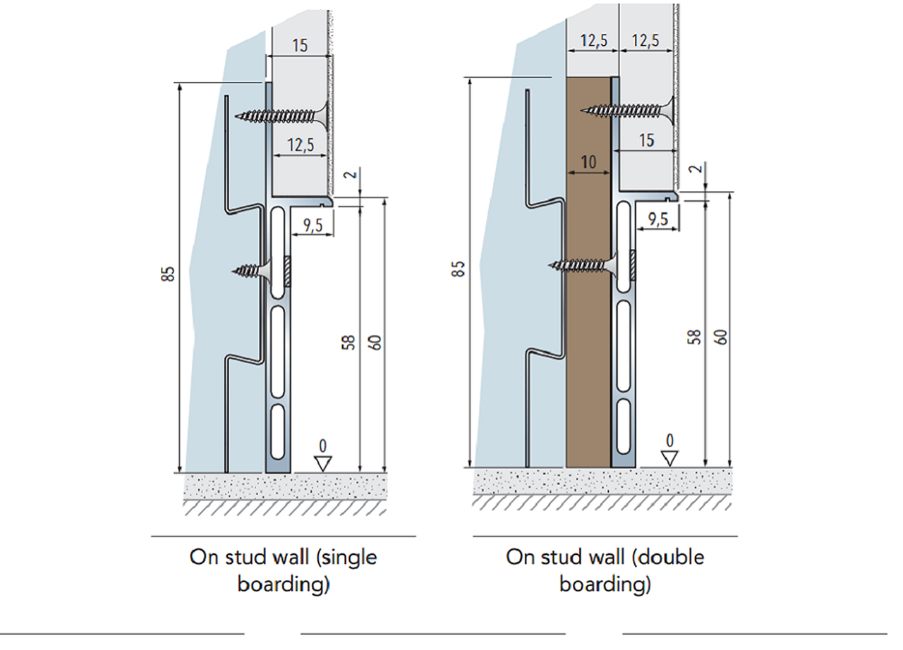 • The profiles create 60 mm high skirting but can be installed at a higher level if required. Useful height for skirting 58 mm.